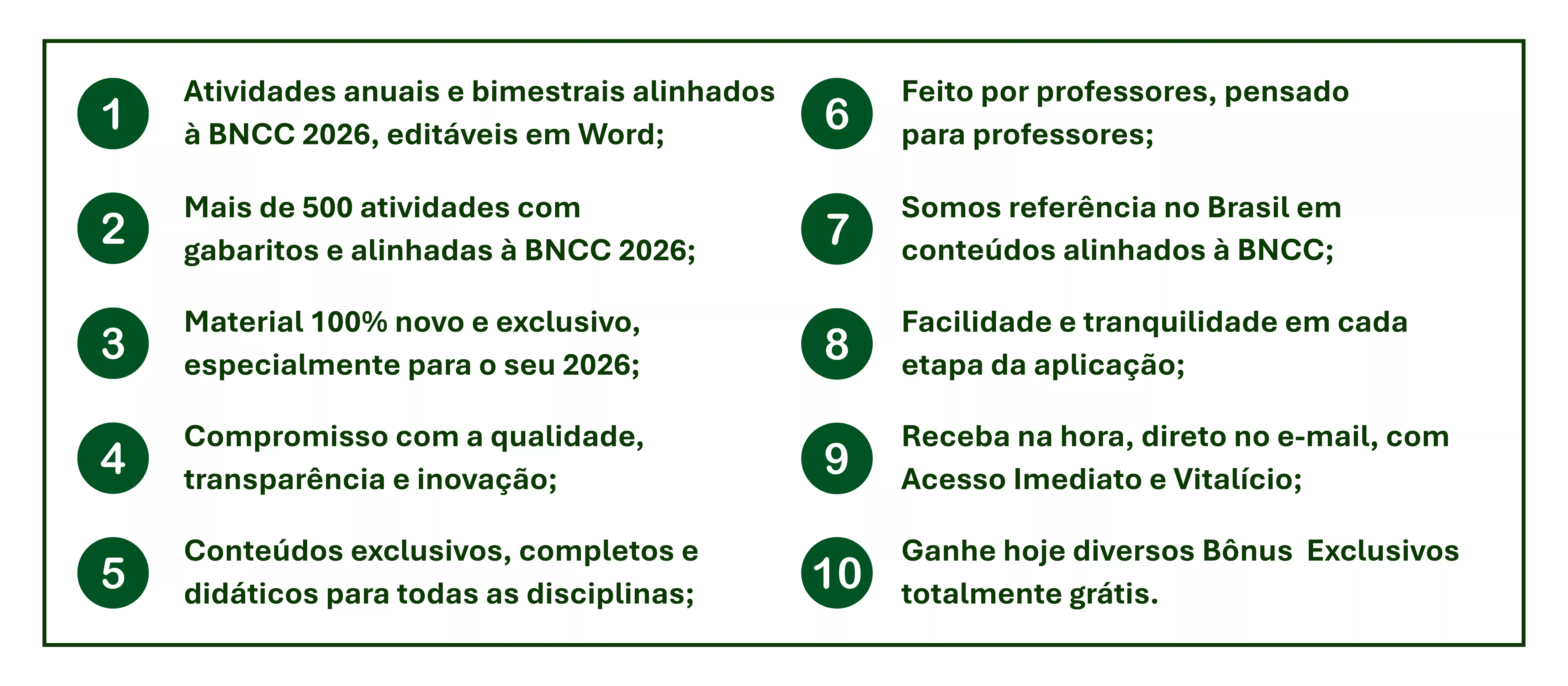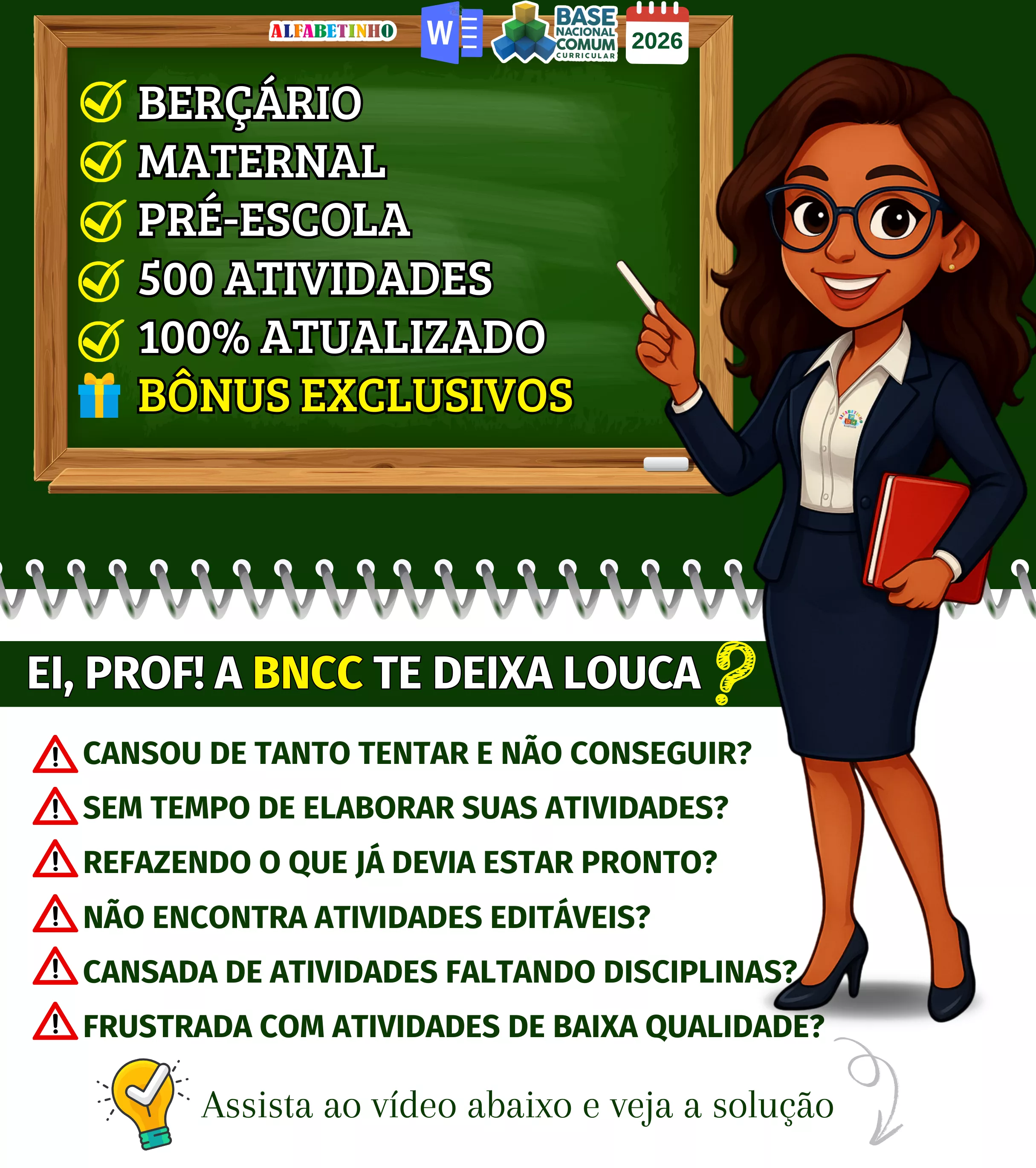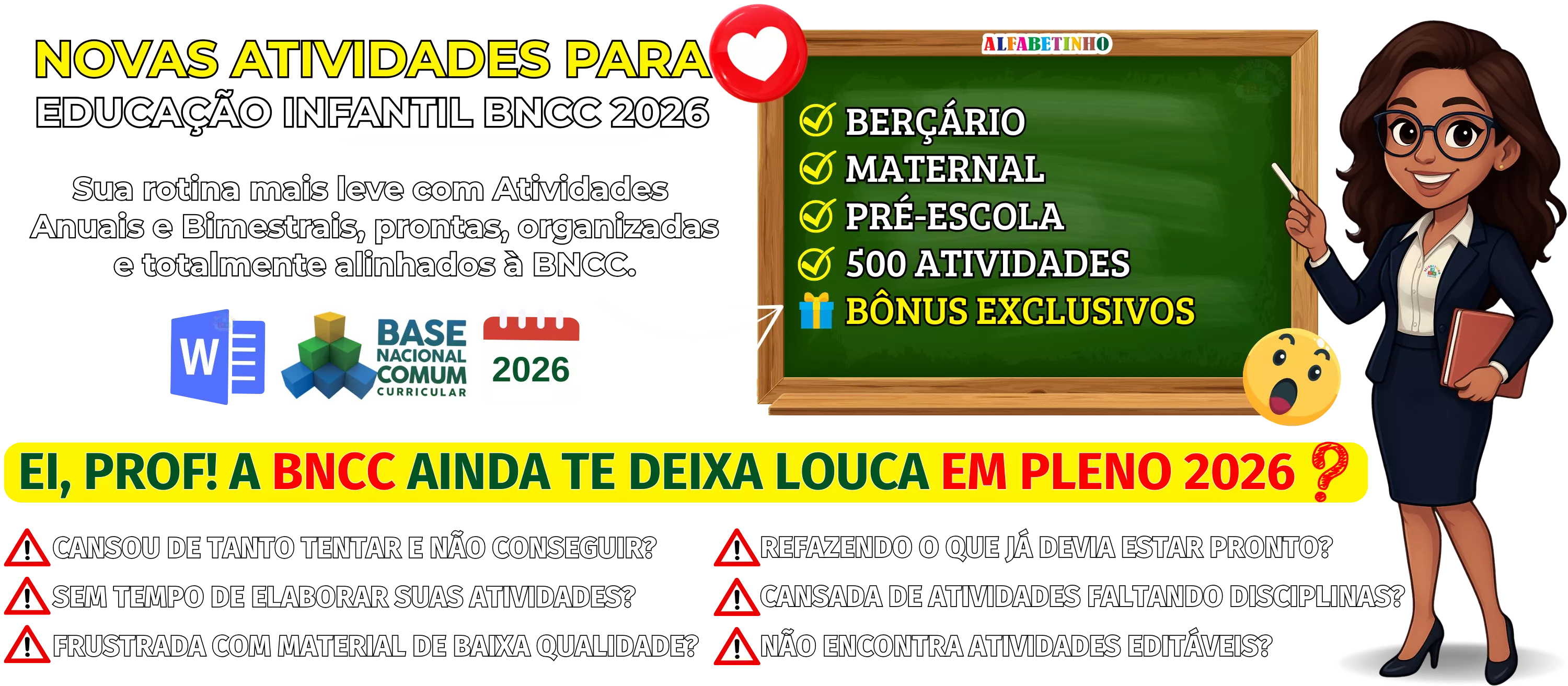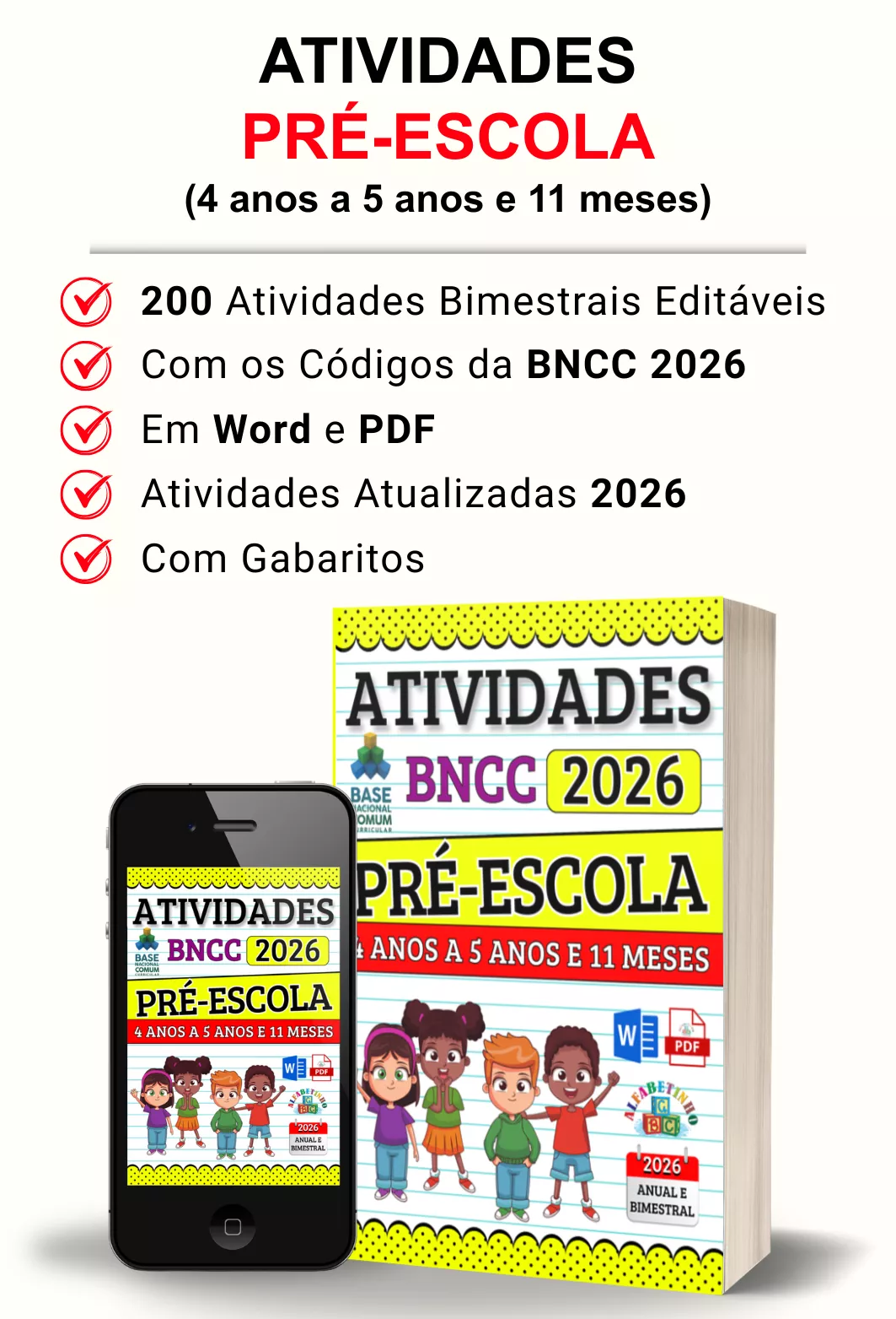 Atividades anuais e bimestrais completos, atualizados conforme a BNCC 2026, totalmente editáveis no Word e adaptáveis à sua realidade escolar. Praticidade, qualidade e inspiração para professores que amam ensinar!